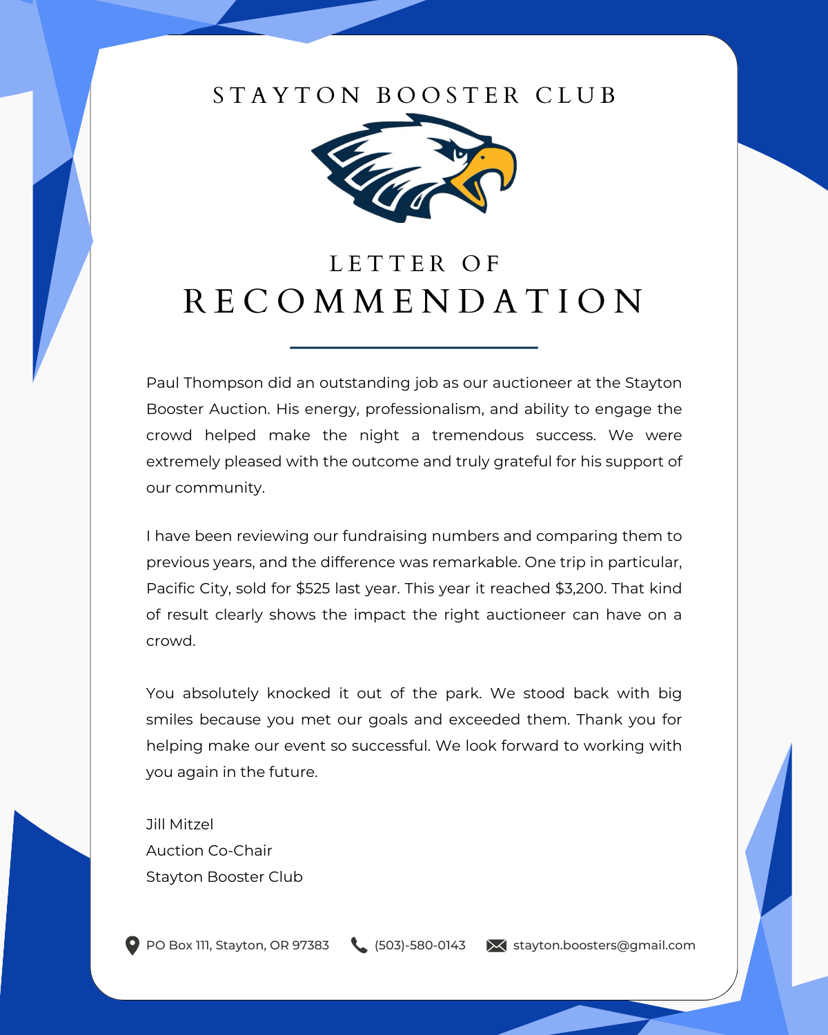 Organizations throughout Oregon trust Paul Thompson to deliver engaging, high-energy auctions that drive real results. From school fundraisers to community benefit events, his ability to connect with the crowd consistently helps clients exceed their goals and maximize fundraising success.